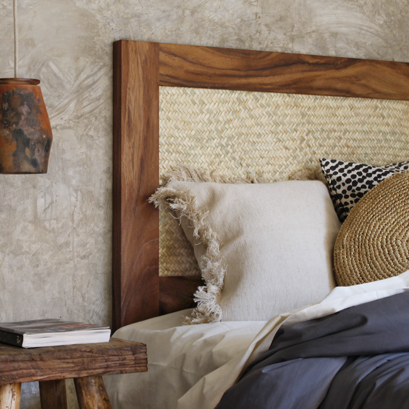 Fabricada con una combinación de madera sólida y listón de madera enchapado de parota, la cabecera Mita combina superficies de madera pulida con aplicaciones de petate tejido a mano. Esta mezcla de materiales permite un equilibrio entre estructura, calidez y detalle, aportando carácter sin perder sobriedad.
